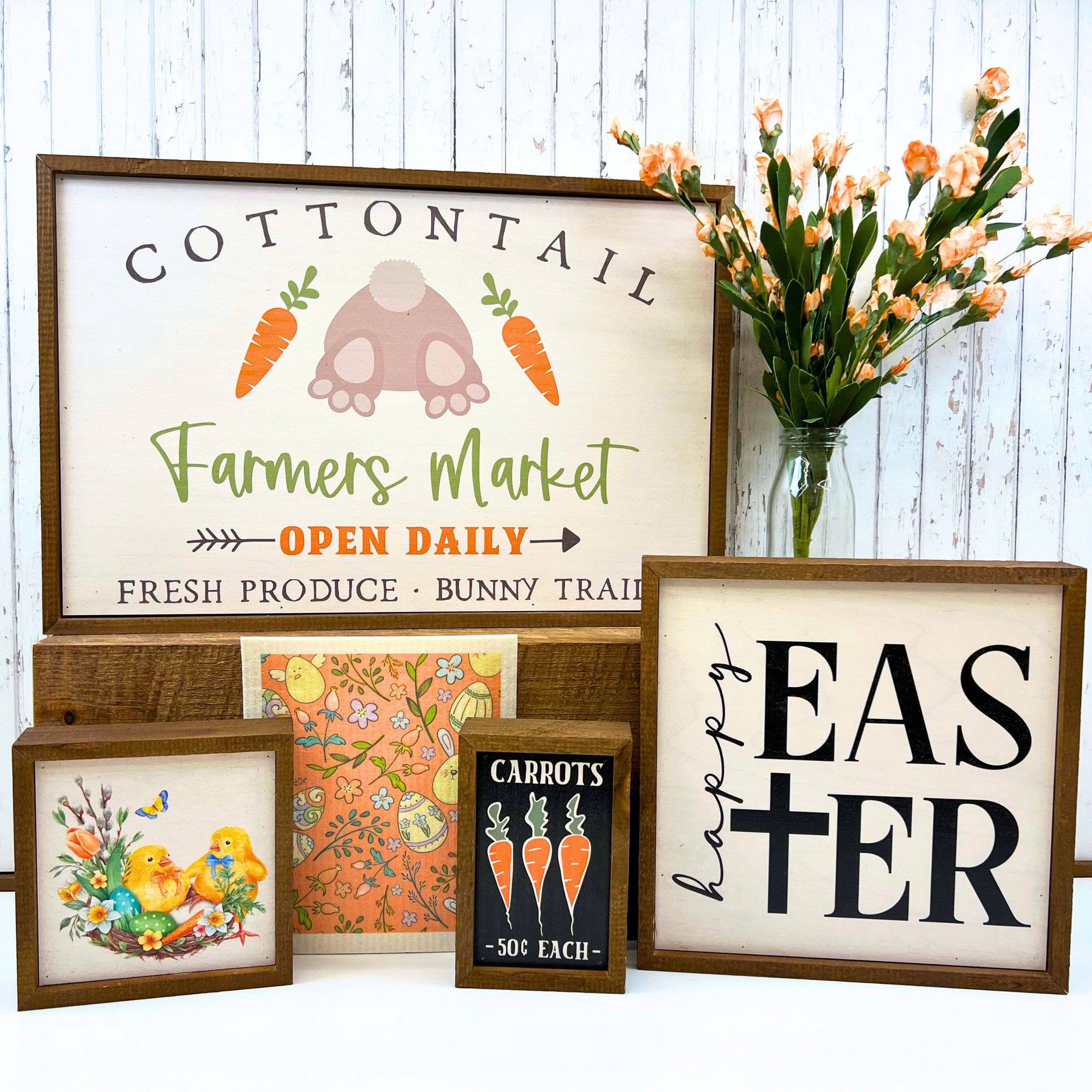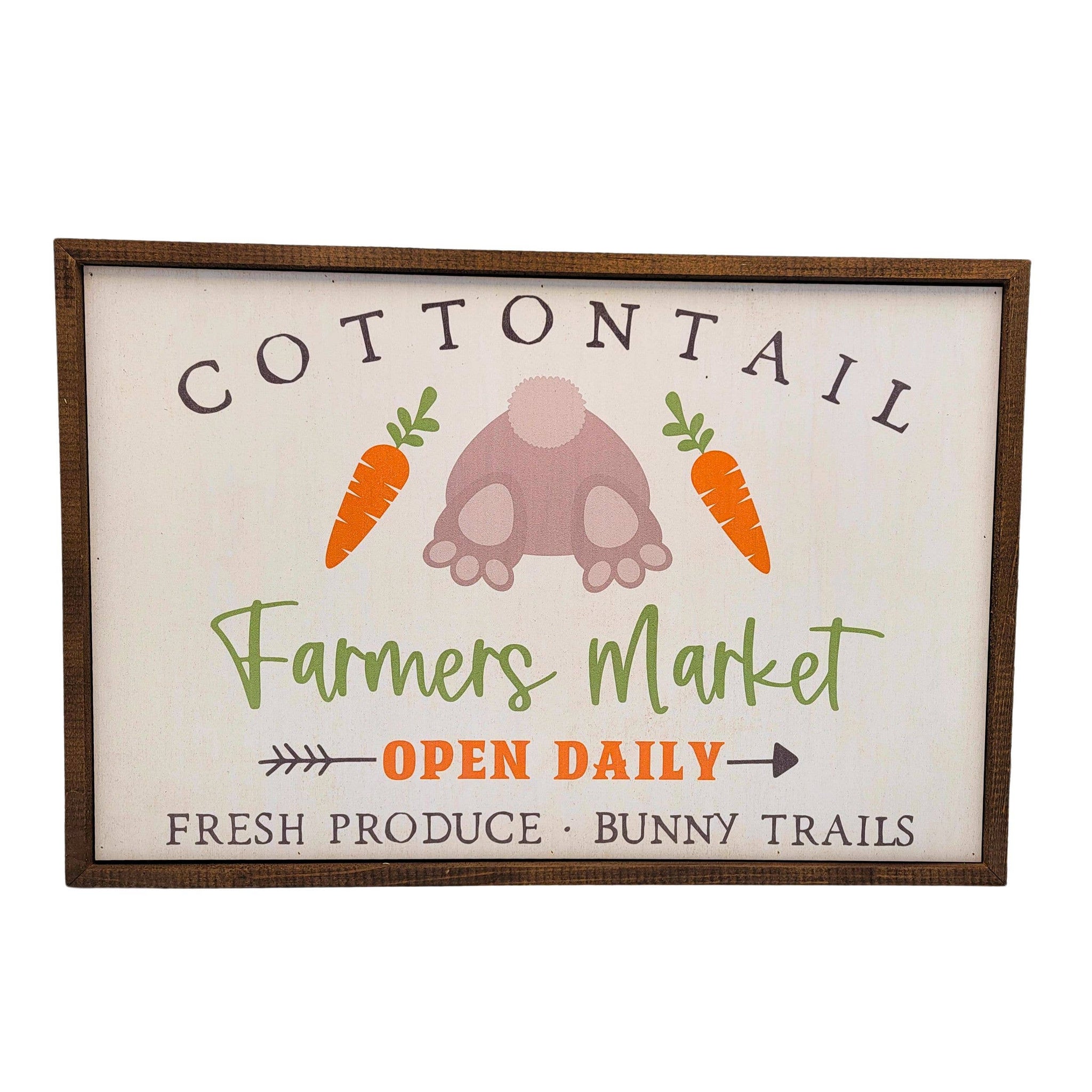 Cottontail Farmers Market Easter Signs - Home Decor. All our signs are build into a wooden box frame with a rustic touch. Signs are hung directly off the frame.